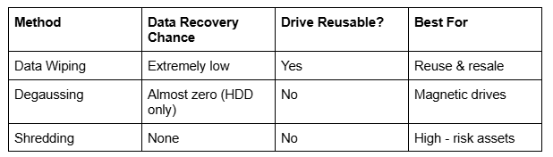 Wiping, degaussing, and shredding are effective methods for data destruction. The choice of method should be based on the required security level and whether the device will be reused. Data wiping is ideal for drives that will continue to be used, while degaussing quickly sanitizes magnetic media. Shredding is recommended for the highest level of security when recovery must be impossible.